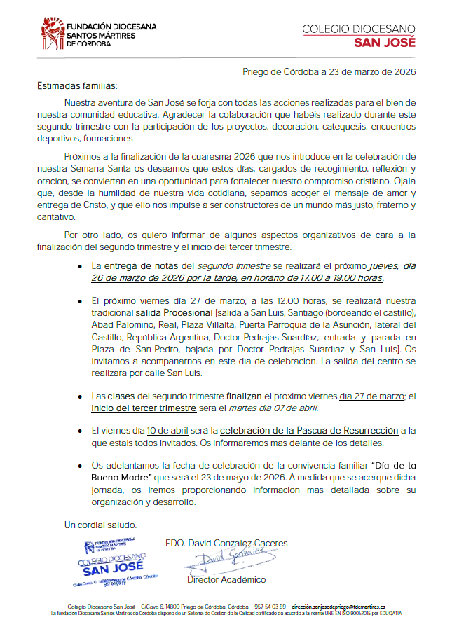 Con motivo de la finalización del segundo trimestre del curso escolar, ponemos a disposición de las familias una circular informativa en la que se recogen los aspectos más relevantes relacionados con el cierre de este periodo y el inicio del siguiente.